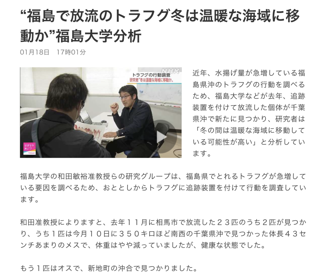 NHK News reported that loggers from Biologging Solutions were used in a survey of Japanese pufferfish in Fukushima Prefecture, resulting in the recovery of two individuals. This data is expected to provide valuable insights into the migration routes and behavior of Japanese pufferfish, whose catch volumes have been increasing in Fukushima Prefecture in recent years. Please click here for more details.